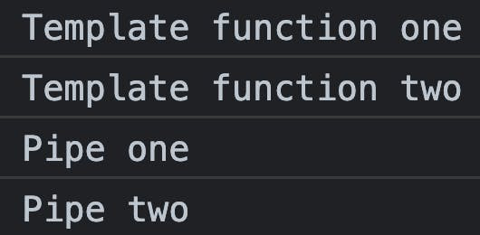 The first time the component renders, all of the template functions and pipes will be evaluated which we can see by the messages they log out to the console: